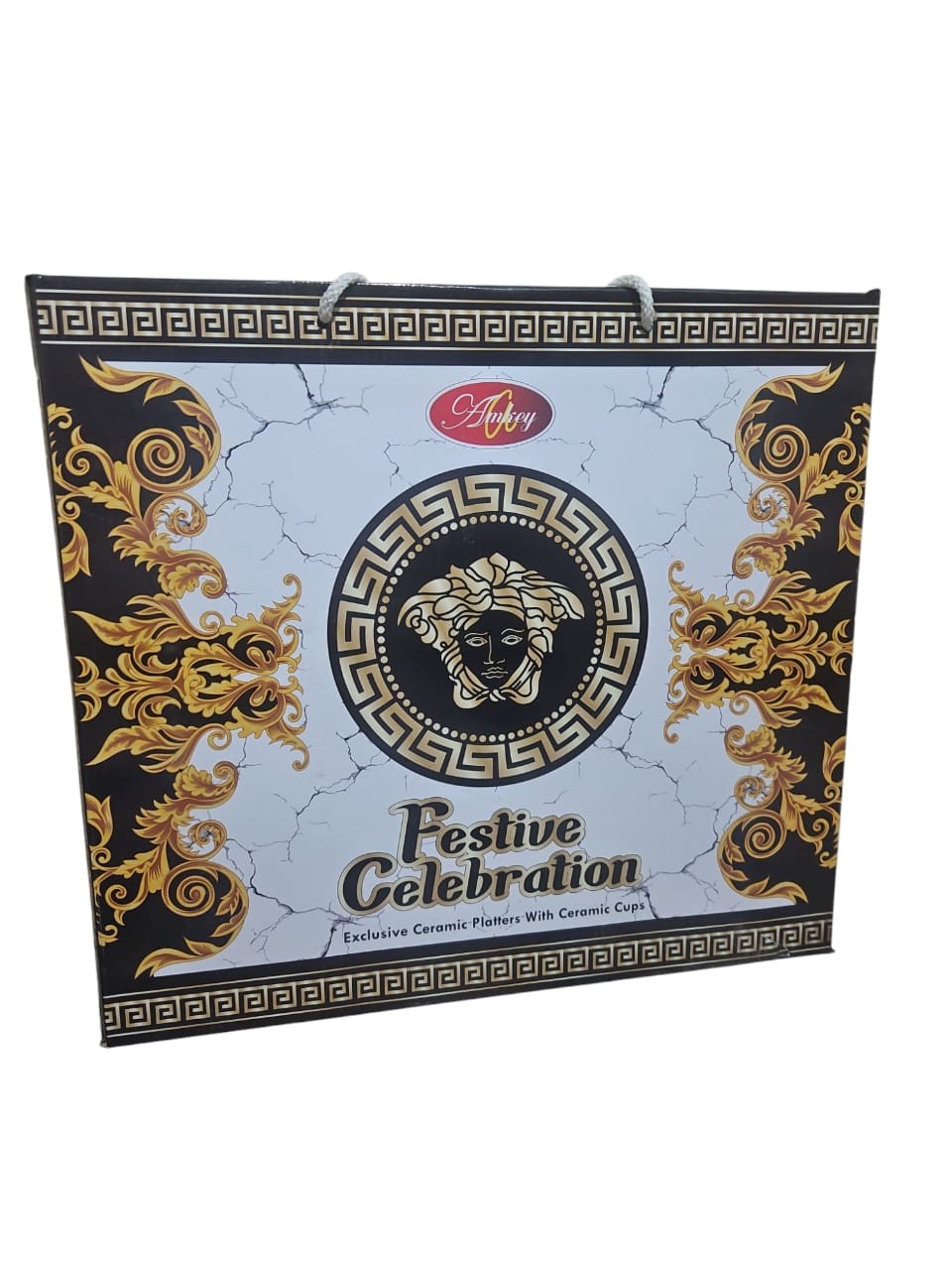 AASHYANA Ceramic Coffee/Tea Cups Set for Tea of 6 & Serving Platters(Set of 10, 150 ML, White And Gold)