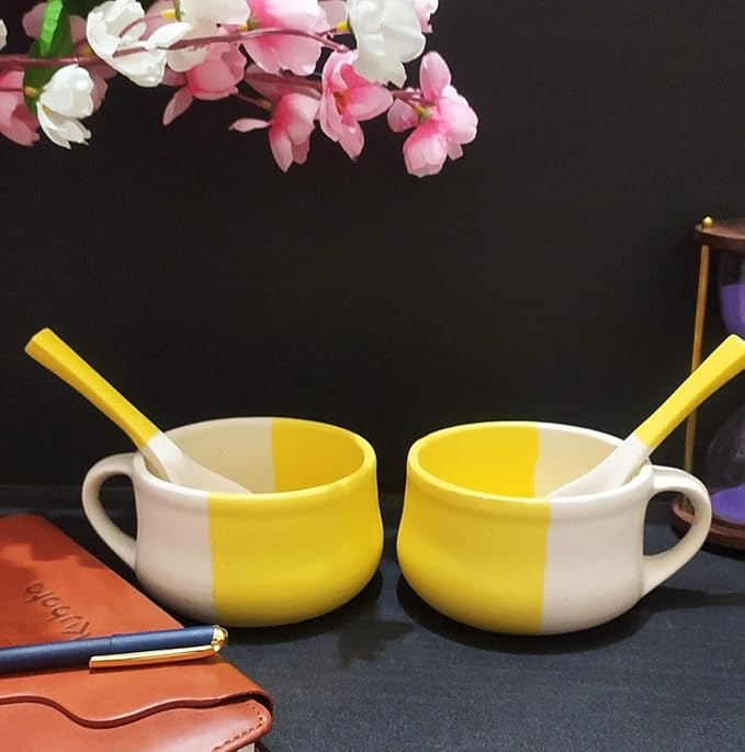 Handpainted Blue & Yellow shed design multipurpose ceramic bowls with ceramic spoons, ideal for soup/noodles/cornflakes/desserts and more