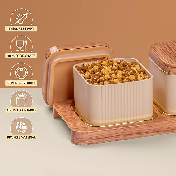 These Dry Fruit Serving Trays Combos are specially designed with attractive, smooth matte texture and ribbed design on two sides with a wooden gloss finish lid with gold rims, making it convenient to accessorize your Home in a stylish way. The Wooden timber finish and Gold potray a rich and festive look allowing you to use it during various festivities and occasions. Embellish your home, dinning area and kitchen using this elegant snack serving set. This Dry Fruit Serving Bowls with tray can be used for various occasions and they make as great gifts for the festive season. This Dry Fruit serving tray is designed to perfectly fit and carry all three air-tight containers together. It's ergonomic design allows you to have a good grasp when serving and its square cubical shape makes its easily stackable allowing you to optimize your space better.