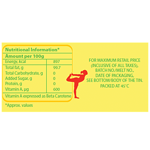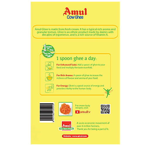 Amul High Aroma Cow Ghee is made from pure cow milk, which has a rich taste and high aroma. From Amul's house, you can blindly trust its hygienic aspect. With full of flavours and a strong aroma, cow ghee is one of the popular ingredients in many Indian dishes. Add this Aroma Cow Ghee to your food and multiply the taste manifold.