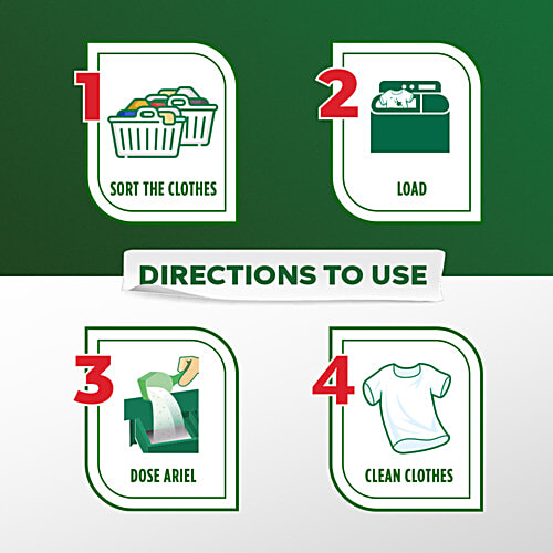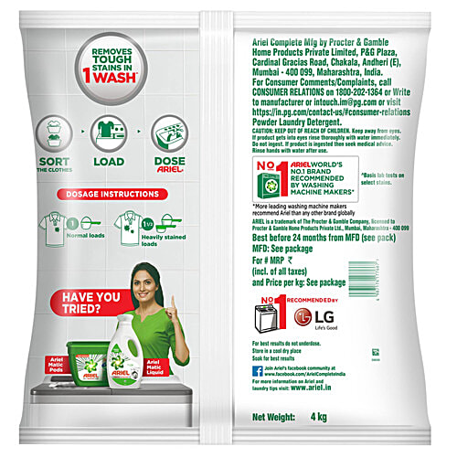 New & Improved Ariel Complete gives you tough stain removal for a bright clean in just 1 wash. Ariel Complete is uniquely designed to deliver outstanding results when used in a semi-automatic machine as well as when used as a hand wash detergent. Ariel Colour Care has New Oxi-stain fighters for clothes to stay clean and stain-free wash after wash. It also provides deep down cleaning and long-lasting freshness. Ariel Complete washing powder also provides deep down cleaning and long-lasting freshness. In just 1 scoop for normal loads and 1.5 scoops for heavy loads, it provides brilliant stain removal along with the value. Ariel Completes cutting edge technology provides impeccable cleaning for all your clothes and removes tough stains like juice, chocolate, tomato and butter/ghee along with maintaining the brightness of the clothes. So now, say goodbye to stains and dullness!