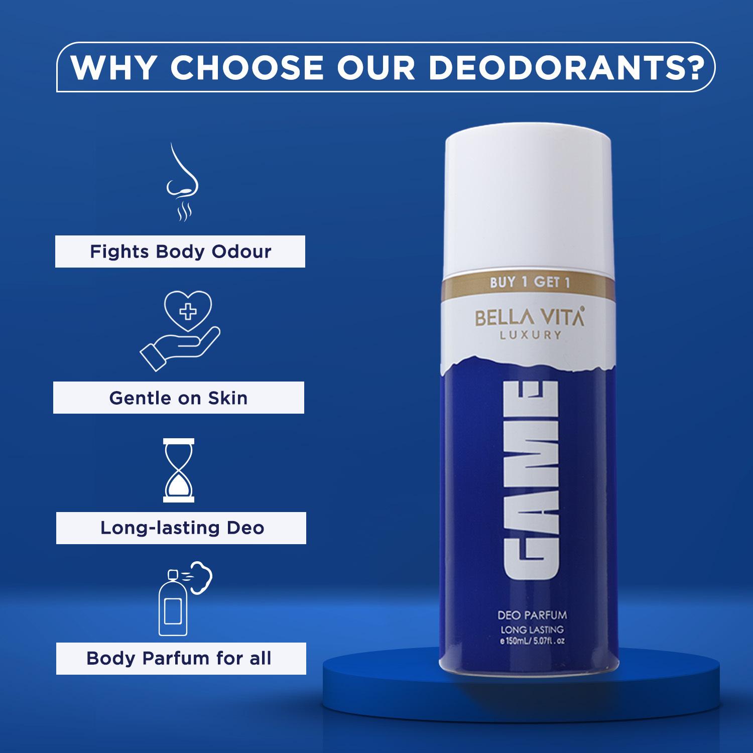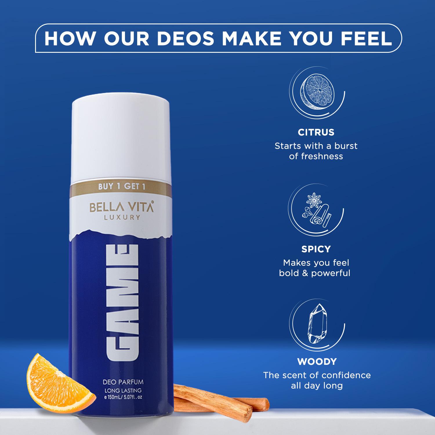 Bella Vita Luxury GAME No Gas Deodorant Unisex Deo Perfume for Men and Women 150 ML Each, Buy 1 Get 1 FREE