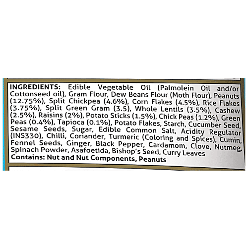 Bikaji Aslee Bikaneri All-in-One Kuch-Kuch is an exotic blend of spicy lentil shreds, nuts, raisins, rice flakes, corn flakes, water lemon seeds and sesame seeds. Its a perfect tea time snack.