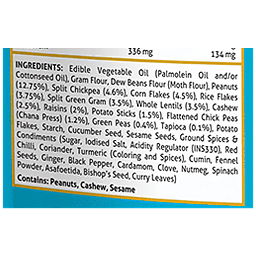Gram Flour, Green Gram, Groundnuts, Gramm, Potato, Rice Flakes, Corn Flakes, Tapioca Starch, Watermelon Seeds, Cashew, Raisins, Sesame Seeds, Sugar, Salt, Citric Acid, Coriander, Cumin Seeds, Cloves, Spinach, Cardamom, Vegetable Oil, Groundnut Oil, Corn Oil