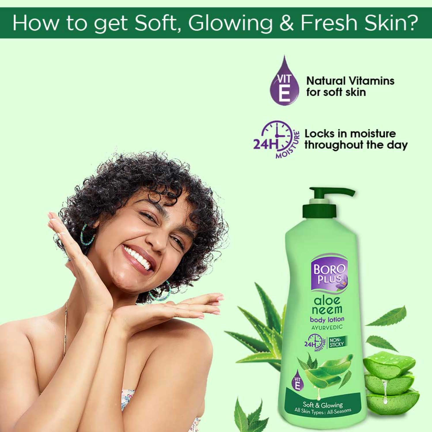 Non-sticky, Non-greasy formula Quick absorption, 20 layers deep into epidermis Hydration of Aloe Vera and Antiseptic protection of Neem Soft and Glowing skin 24 hr Moisture
