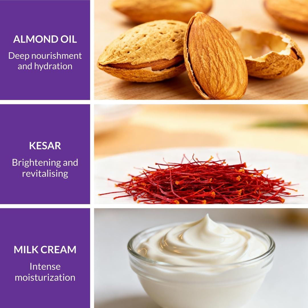 Natural goodness of nourishing almonds and moisturizing milk cream Maintains moisture balance Makes skin soft and healthy
