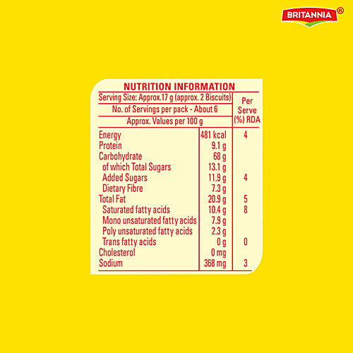 Britannia NutriChoice Digestive Biscuits are fibre-rich biscuits packed with the richness of wheat flour (atta) and bran. With every bite, you experience the coarseness of this fibre-rich biscuit. These Digestive cookies are baked to precision, making them a great snack option. Available in a large pack with 50 g free. Go ahead and make a good choice.