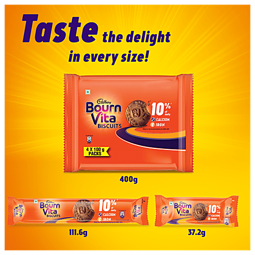 Bournvita biscuits provide the choice of a delicious biscuit enriched with the wholesome goodness of bournvita. They are crunchy chocolatey cookies that have the right balance of taste and health. A great choice to have as a morning biscuit, tiffin or part of a healthy breakfast! Also available in different packs - 400 g and 37.20 g.