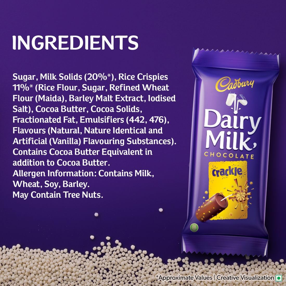 Kuch achha ho jaaye, kuch meetha ho jaaye with Cadbury Dairy Milk. Generously made with a glass and a half of milk, Cadbury Dairy Milk Crackle offers crunchy rice crispies in every piece. Cadbury Dairy Milk is the perfect meetha for sharing everyday moments of joy with your loved ones. This milk chocolate bar pack is perfect sweet for snacking & storing in the fridge, or as a chocolate gift pack for gifting on special occasions like birthdays and get-togethers. Every chocolate bar of Cadbury Dairy Milk is made from 100% sustainably sourced cocoa. It is suitable for vegetarians.