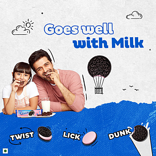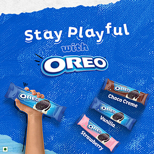 OREO: milk's best friend for over 100 years! Cadbury OREO Vanilla creme sandwich biscuit consists of two chocolatey biscuits with a rich vanilla creme filling between them. Cadbury OREO creme biscuits are made with cocoa, which defines their unique chocolatey flavour. Add this crunchy delight to your snacks and gift yourself rich and smooth joy. OREO biscuits are perfect for snacking or enjoying as a treat at any time of the day. Twist, lick and dunk! Enjoy OREO sandwich cookies with a glass of milk or add them to your favourite recipes such as cakes and milkshakes! Add a scoop of vanilla ice cream to OREO biscuits to make your own creamy dessert! Available in single & family/ combo packs. This biscuit pack is suitable for vegetarians.