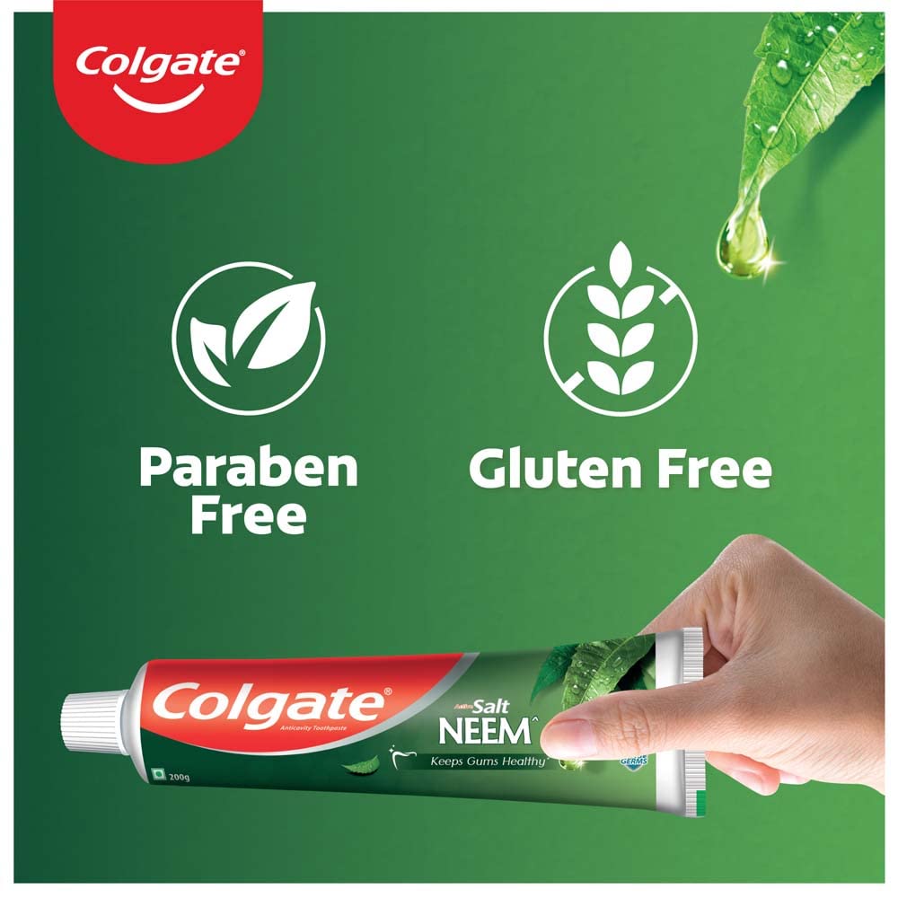 Its GERM-FIGHTING FORMULA WITH SALT helps remove sticky / hidden germs, giving you healthier and cleaner teeth. It contain Neem , that is known for antibacterial properties. This toothpaste helps in keeping gum tight and pyorrhea away. Recommended usage: Brush twice a day for 2 minutes each time. Children below 6 years of age should have adult supervision To maintain good oral hygiene brush twice a day for 2 minutes each time, rinse with mouthwash for 30 seconds, and replace your toothbrush every 3 months Colgate is India's most trusted oral care brand and certified by Indian Dental Association. This toothpaste is Gluten free