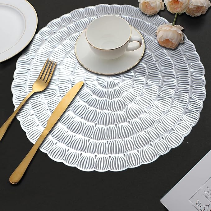 Dakshya Industries PVC Pack of 6 Carvine Round Shape Cutwork Design for Kitchen, Restaurant, Dining Table mats and Dressing Table mats (Silver)