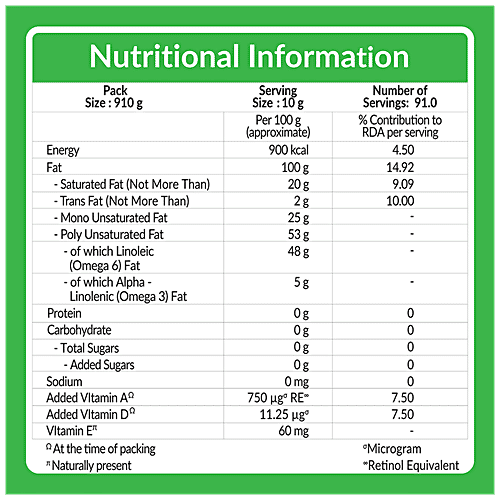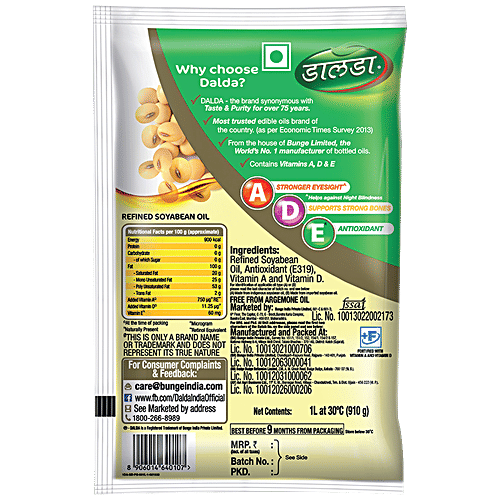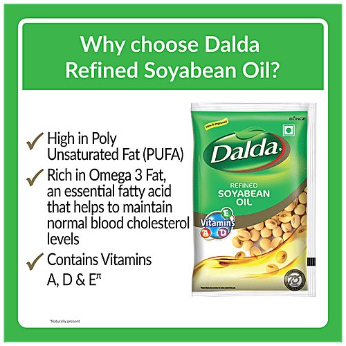 Full of vitamins A, D, and E, Dalda Refined Soyabean Oil from the house of Dalda is a premium quality product. It is one of your best culinary companions in the kitchen. It is a healthy cooking oil that contains high amounts of PUFA, rich in omega-3 unsaturated fats and vitamins A, D, and E.