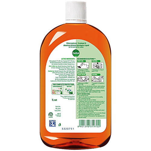 Dettol Antiseptic Liquid protects you and your family from 100 illness causing germs. It comes in a fresh pine fragrance. The topical antiseptic liquid sanitizes your home and helps maintain your personal hygiene. The Dettol first aid antiseptic liquid can be used to protect against infection from cuts and scratches, disinfect toys, and sanitize baby wear leaving everything clean and fresh. It can also be used as a household disinfectant and cleaner on surfaces or in laundry cleaning to kill germs. This liquid antiseptic is recommended by Indian Medical Association and can be kept in your emergency first aid kit