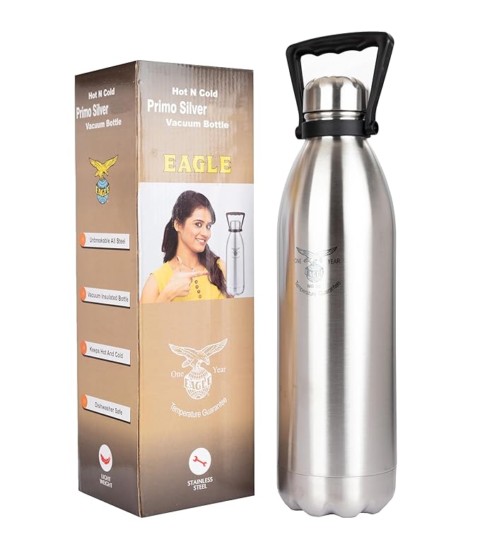 Eagle Primo Silver Stainless Steel Vacuum Insulated Flask with Handle 1900ml| Hot and Cold Water Bottle with Screw lid | Double Walled Silver Bottle for Home, Office, Travel