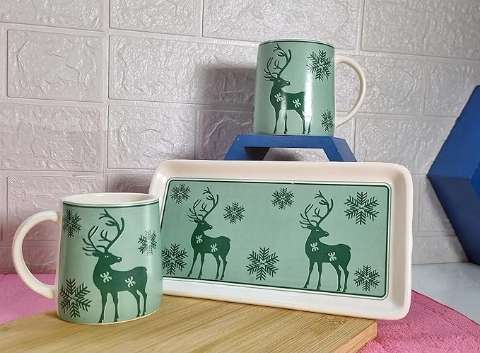 Edencart Green Coffee Mug Set of 2 with Tray Ceramic Mugs to Gift to Best Friend, Tea Mugs, Microwave Safe Coffee Mugs, Ceramic Tea Cups