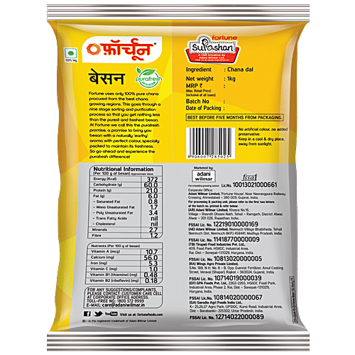 Fortune Besan is hygienically made from 100% chana dal and passes through more than 25 quality checks and is processed with advanced grinding technology which retains the flavours and aroma of natural chana dal. The highest grade of chana dal and only standardized coloured chana dal passes through our advanced colour sortex machine for grinding to give consistency in Fortune Besan leading to the finest taste of any recipe.