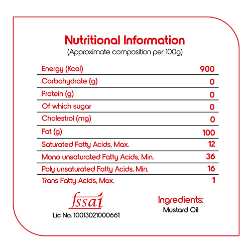 Fortune Premium Kachi Ghani Pure Mustard Oil, traditionally extracted from the first press of mustard seeds, comes with a high pungency level and strong aroma. Being pure, our cooking oil retains its natural properties and mustard oil benefits. Its strong aroma and pungency will spice up your cooking.