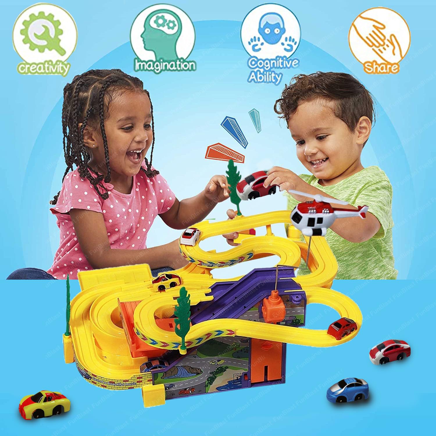 FunBlast Track Racer Racing Cars Toy for Kids - Ramp Racing Toy Car Track Set, B/O Ramp Racing 4 Pcs Gliding Cars & Track Racer with Sound & Lights for 3+ Years Kids, Toys & Games for Kids