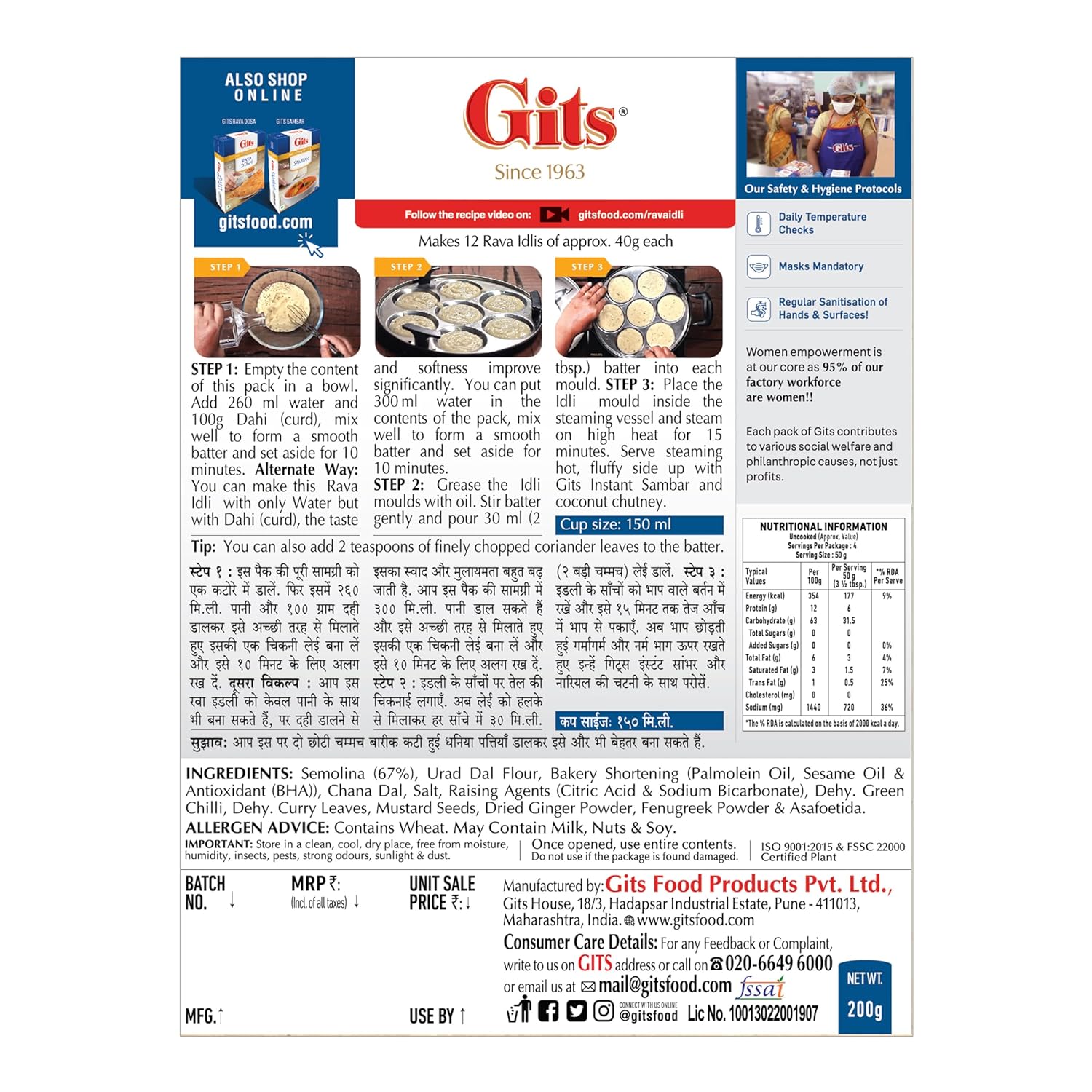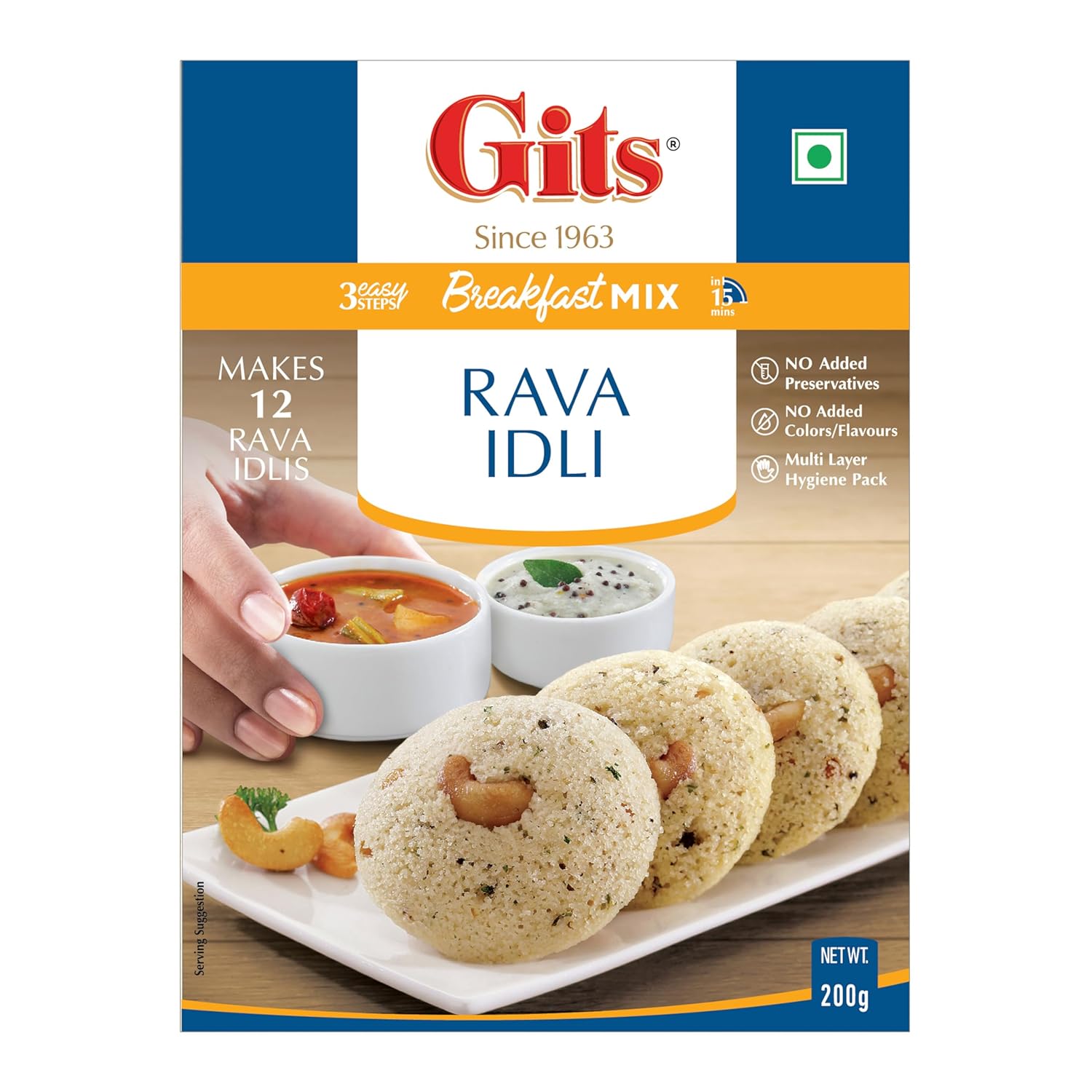 Gits Instant Rava Idli Breakfast Mix, Makes 12 per Pack, Pure Veg, South Indian Breakfast Recipe, 200g