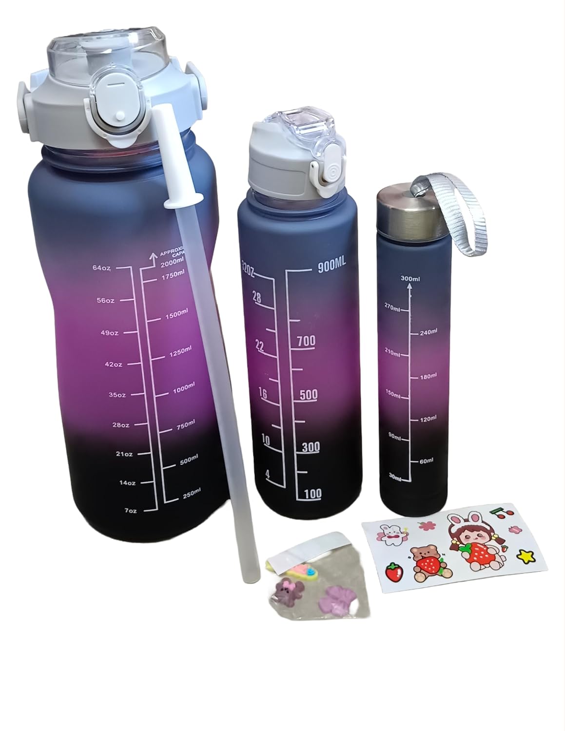 Hydration Companion: This set includes three reusable water bottles (2000 ml, 900 ml, and 300 ml) to keep you hydrated throughout the day. Motivational Design: The large 2000 ml bottle features an inspiring graphic with motivational time markers to encourage continuous hydration.