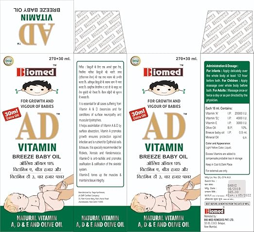 Growmed AD Vitamin Oil 340ML Baby Massage Oil for Healthy and Fairness Skin