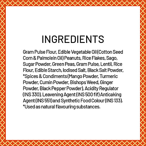 Haldiram’s Khatta Meetha is a delightful blend of sweet and tangy flavours, featuring golden raisins, crunchy chickpea flour strings, and a hint of tart spices. This mildly spiced snack combines fried green peas, boondi, lemon sev, and classic namkeen, creating an irresistible treat for your taste buds. The perfect balance of crunch, sweetness, and zest, it’s an ideal teatime companion!