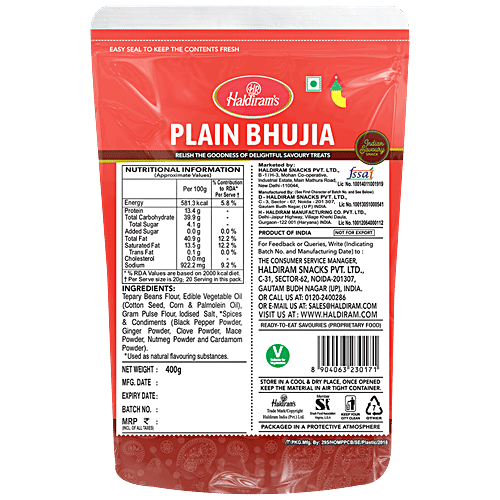 Haldiram Plain Bhujia is Traditional Indian Namkeen with Teapary beans flour and mild spices. Haldiram is India's one of the most popular brands for snacks and Sweets. Offers a wide range of Sweets, Namkeens, Cookies, frozen food, Wraps and many more Indian snacks. Haldiram's began as a tiny shop in Bikaner. What began as a small-town enterprise in India is today a global phenomenon. Haldiram's is a way of life for Indians no matter which country they live in.