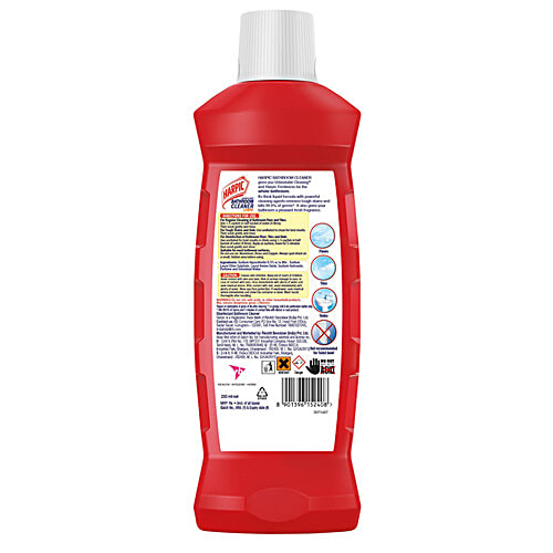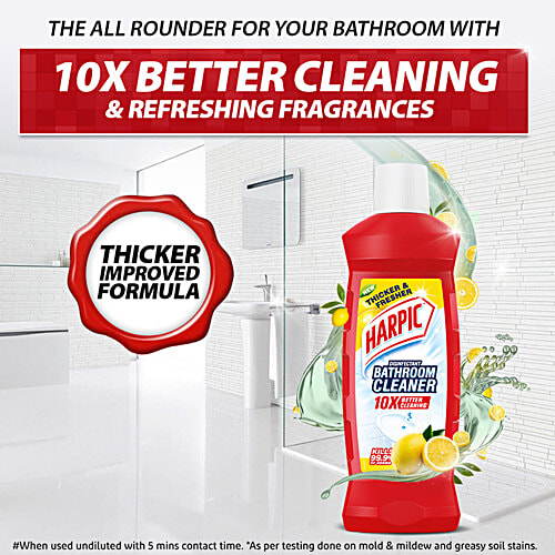 Harpic bathroom cleaner gives you unbeatable cleaning on greasy soil and particulate matter and Harpic freshness for the whole bathroom. Its thick liquid formula with powerful cleaning agents removes tough stains and kills 99.9 percent of germs. It also gives your bathroom a pleasant fresh fragrance. Used for regular cleaning of bathroom floor and tiles. Use 1.5 capfuls in half bucket of water. For tough stains and sink. Use undiluted to clean for best results. Then scrub gently and rinse. For disinfection of bathroom floor, tiles and sink. Use undiluted for best results or dilute using 1.5 capfuls in half bucket of water. Apply on surface, leave for 5 minutes then scrub gently and rinse. Suitable for most bathroom surfaces. Do not use on aluminium, brass and copper. Always spot check on a small, hidden area before using. Always use Harpic bathroom cleaner separately. Do not mix with other products.
