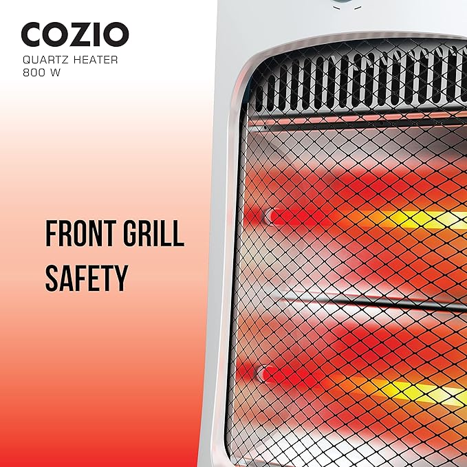 Cozio comes with 2 Quartz heating tubes providing more warmth Front grill for safety Safety tip over switch Two heat setting - 400 Watt & 800 Watt