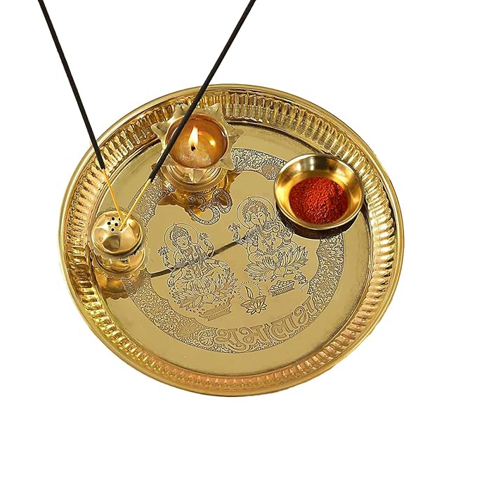 Urbane Home Laxmi Ganesha Pooja Thali | Brass Thali for Diwali Poojan | Thali for Office Temple Poojan | Thali Set for Home with Incense Stick-Diya-Sindoor Holder | 12 Inch | Golden