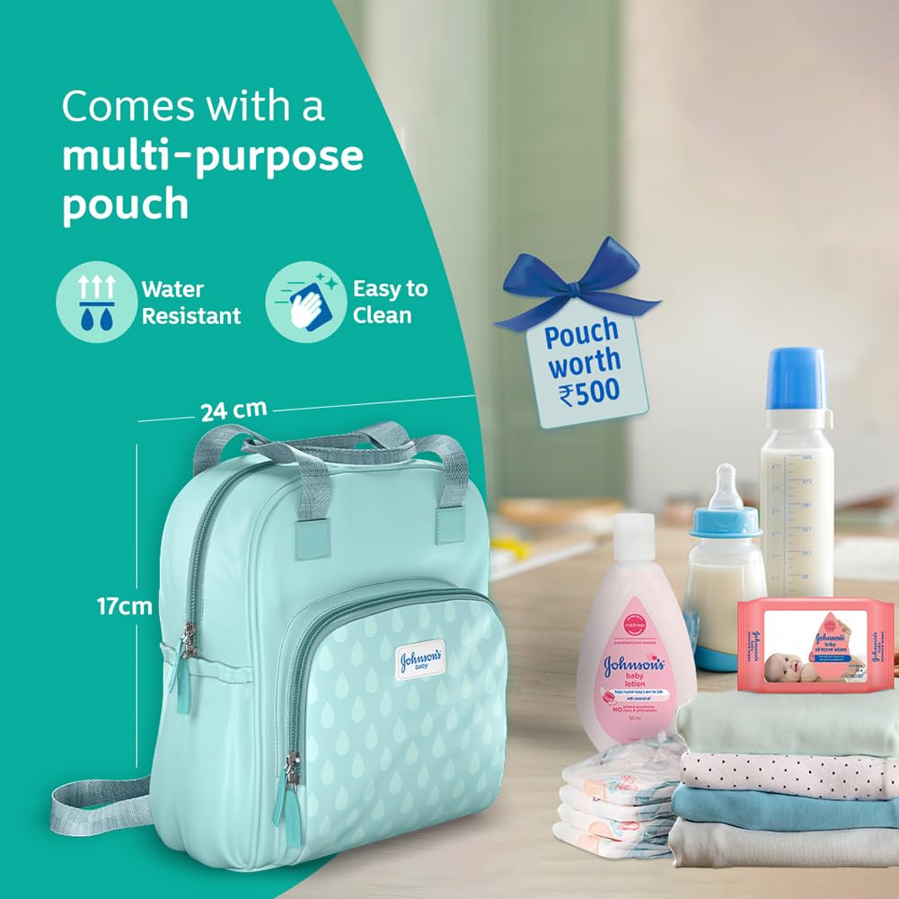 Johnson's Baby Gift Pack with Maternity Backpack/ Bag | Newborn Essentials Kit for Baby Girl/Boy | 11 Baby Products Including Teal Travel Bag & Comb