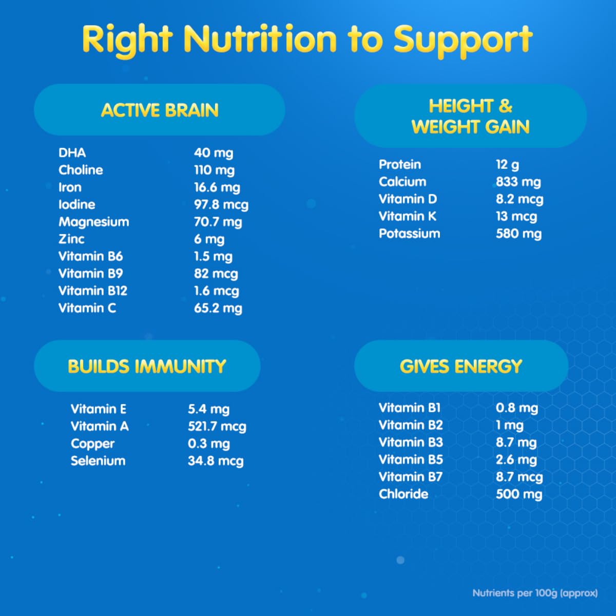Specialized nutrition food for fussy toddlers (2 to 6 years age group) Junior Horlicks is a nutritional food powder which as part of a balanced diet helps meet your child's nutritional requirement right amounts of protein, Calcium, Vitamin D, Vitamin K1 to help support the physical growth of your child With DHA & Choline to support optimal brain development helps improve immunity with nutrients like Vitamin C, E,A, Zinc, Selenium and Copper with goodness of wheat and milk to meet your child's nutritional requirement