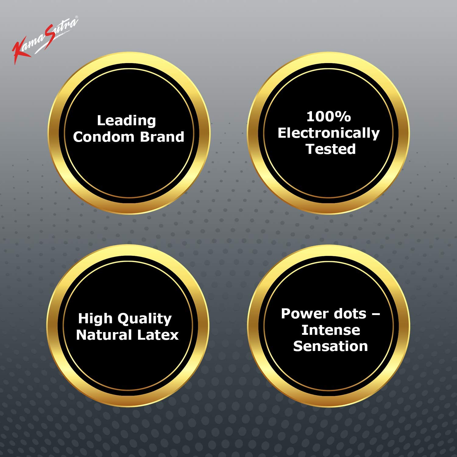 Intense Sensations: A 'KAMASUTRA' condoms, made from natural rubber latex which gives you the most Intense Sensations and natural feeling to the partner. Extra Lubricant: A 'KAMASUTRA' condoms helps in enhancing the pleasure levels to the max with a specially formulated lubricant (Benzocaine - 4.5%) which is present on the inside and helps in extending the pleasure. A 'KAMASUTRA''condoms are very small, easy to carry and disposable, making them the best birth-control method. KamaSutra Dotted condoms helps in enhancing the pleasure levels to the max by providing unique pyramidal & Power Dots. It will drive her wild with desire | Transparent and lubricated natural rubber latex condoms, dermatologically tested and 100% electronically tested