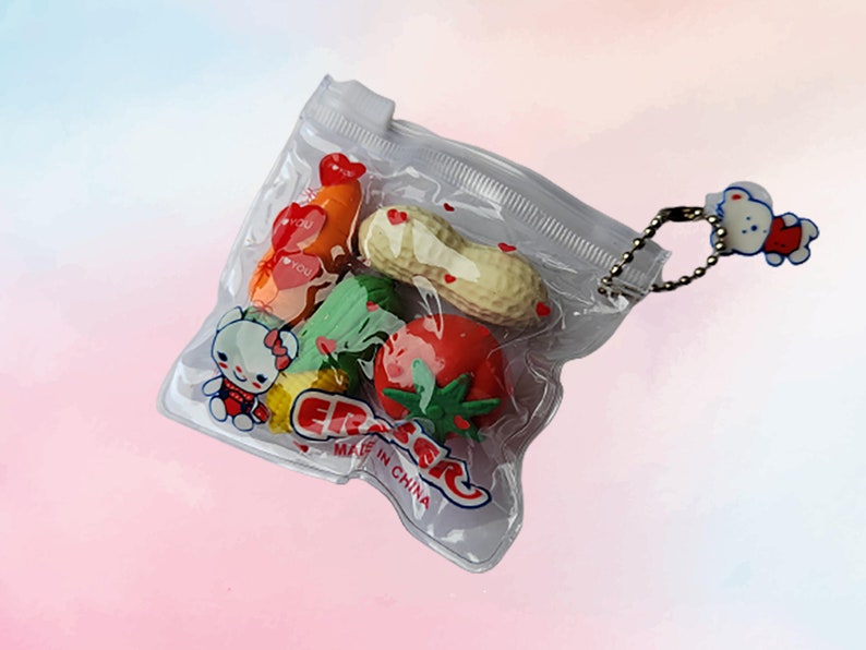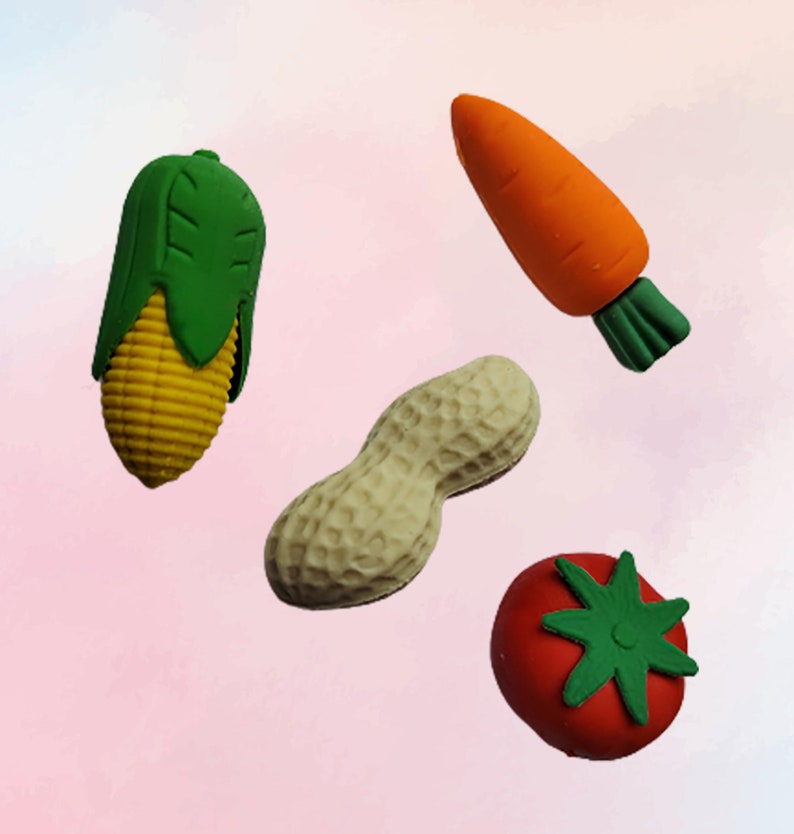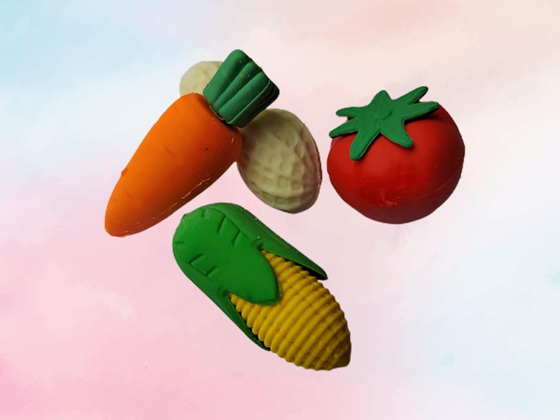 Product: Cute Kawaii Vegetable Eraser Rubber Pack Contents: 1 tomato, 1 peanut, 1 carrot, 1 sweetcorn Material: Rubber Use: School & office stationery supplies