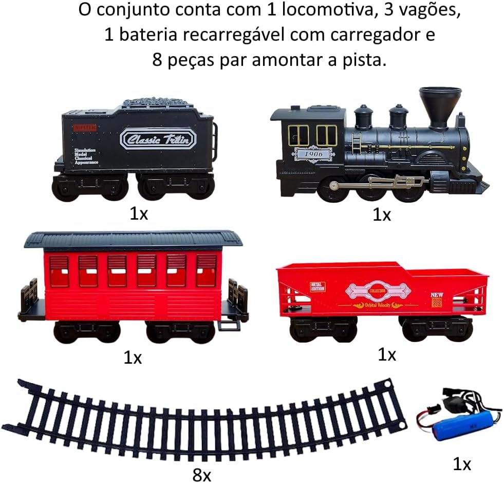 Recursos: Luz, Som e Solta Fumaça (Para sair Fumaça, alimentar o reservatório da Locomotiva com Água para sair a fumaça) Dimensões aproximadas do Trem: 12cm de comprimento Locomotiva e cada Vagão Dimensões dos Trilhos: 78cm de comprimento Montado