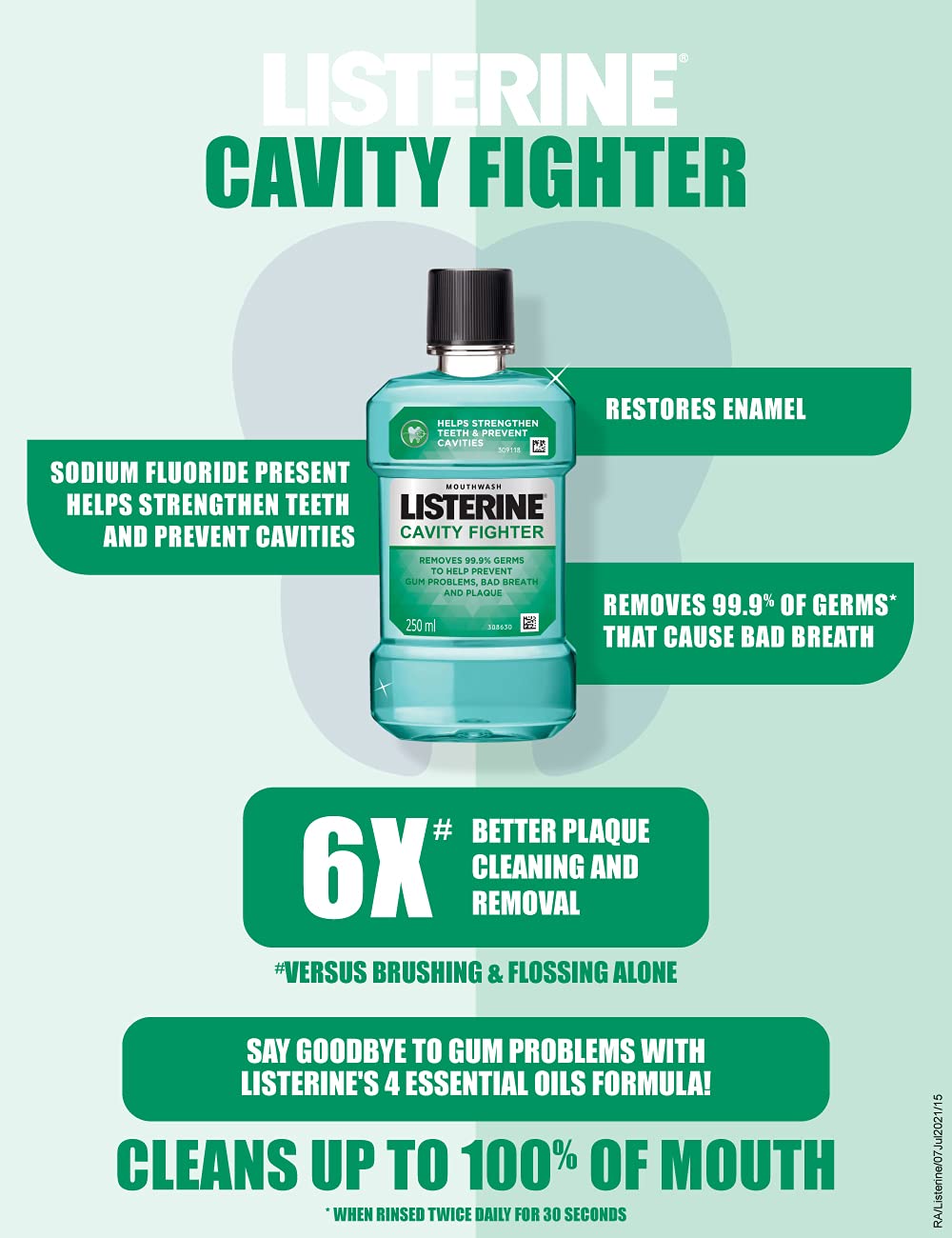 Brushing only covers 25% of your mouth, germs left behind may cause plaque and gum problems Listerine reaches all parts of your mouth and removes 99.9% germs Listerine Cavity Fighter helps strengthen teeth and prevent cavities where brushing may miss Unique formula with 4 Essential Oils deeply penetrates to remove the bacteria in the plaque biofilm Listerine helps reduce gum problems in 2 weeks For best results, rinse with undiluted 20ml twice a day for 30 seconds. Don't rinse mouth with water or eat and drink anything for 30 minutes post rinse