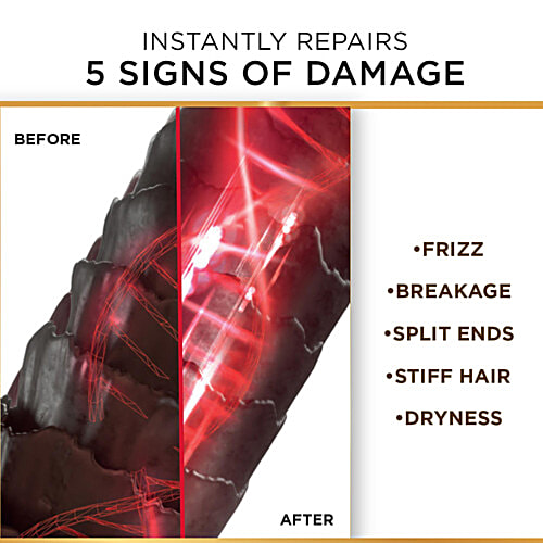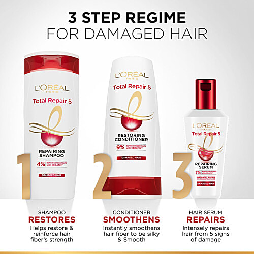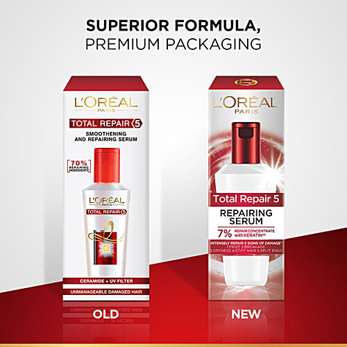 5 Problems. 1 Solution. L'Oreal Paris Total Repair 5 Repairing Serum helps fight against the five visible signs of damaged hair - hair fall, dryness, roughness, dullness and split ends without weighing it down. Damaged hair can lack the natural cement which keeps the hair strong and resilient. To ensure cohesion and strength, the L’Oreal Laboratories have created Ceramide-Cement technology to replicate the hair’s natural cement, targetting the 5 problems. When applied, it instantly attaches itself to damaged areas, repairs and unifies the hair‘s surface, creating a protective
