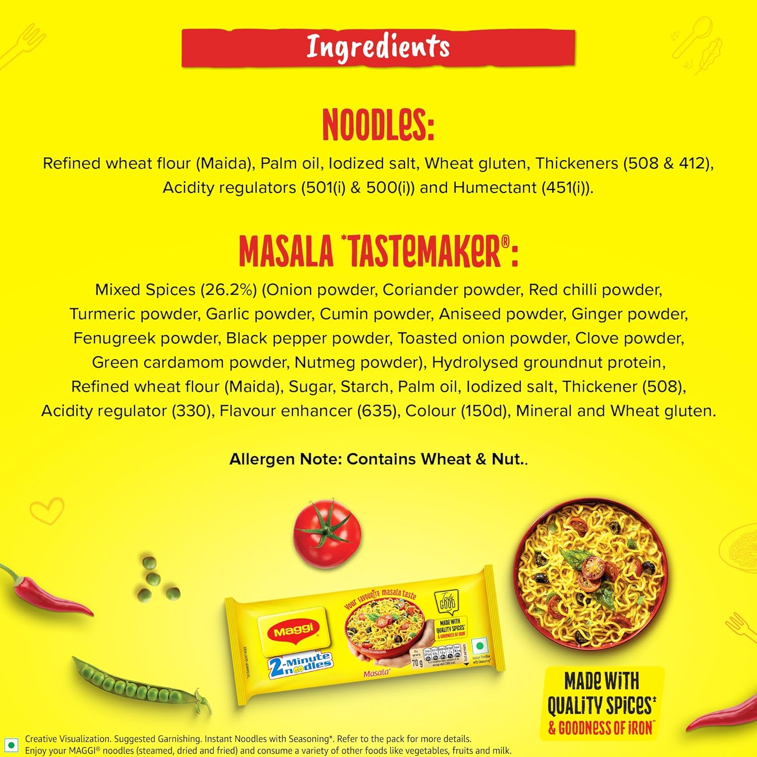 INSTANT MASALA NOODLES: Relish your favorite masala taste with MAGGI 2-Minute Instant Noodles GOODNESS OF IRON: Each serving (70 g) of MAGGI Masala Noodles provides 15% of the daily iron requirement FAVOURITE MASALA TASTE: MAGGI 2-Minute Masala Instant Noodles are made with the choicest quality spices TRULY GOOD: Pick the truly good choice with MAGGI Masala Noodles EASY TO PREPARE: MAGGI Noodles are easy to prepare