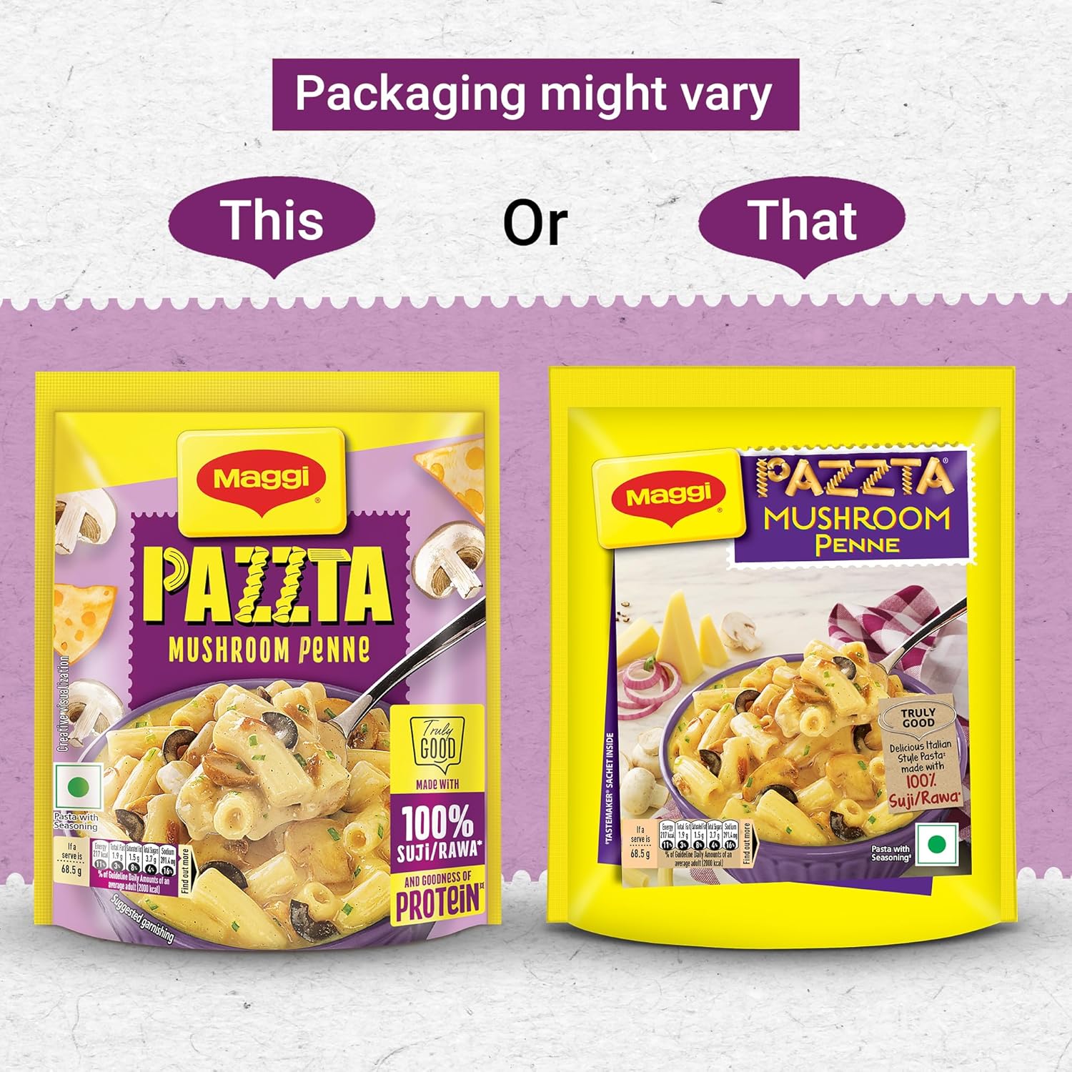 Lip-smacking pasta in a saucy mix Ready in just 5 minutes for instant snacking. Ready in just 5-minutes for instant snacking Contains penne and mushroom bits in a cheesy base 100% vegetarian pasta.