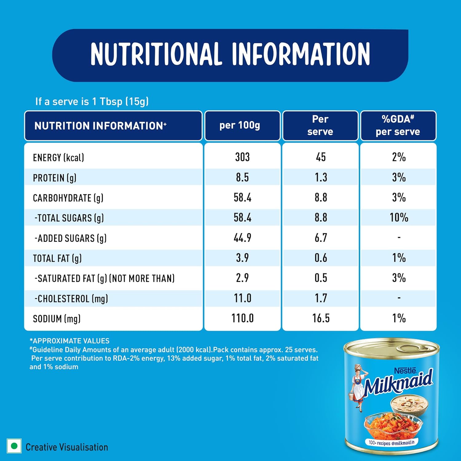 Partly skimmed, sweetened condensed milk from the house of Nestle A perfect dessert partner that elevates desserts to make it rich, creamy and delicious A versatile ingredient to make mouth-watering sweets at home, from traditional to western desserts. Milkmaid has been delighting generations for over 100 years! Also Try - Milkmaid Mini 190 g - a new resealable easy pour pack