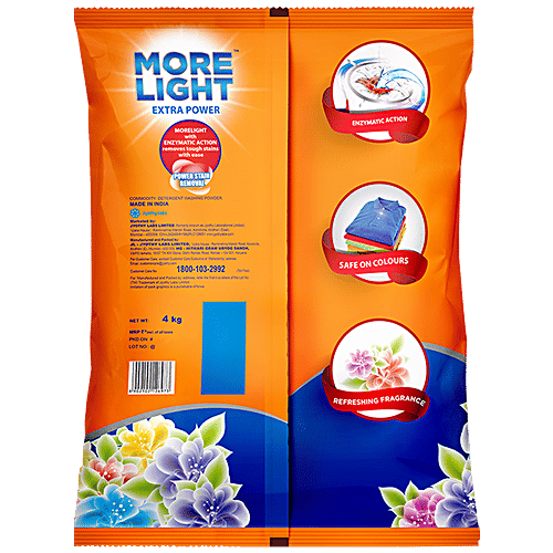 More Light Detergent comes with Extra power and its enzymatic action removes the tough stains with ease without affecting the clothes colour. It removes all the tough stains that spoil your favourite dress. After every wash, it leaves a refreshing fragrance for you to feel the freshness all day long. This product is made in India.