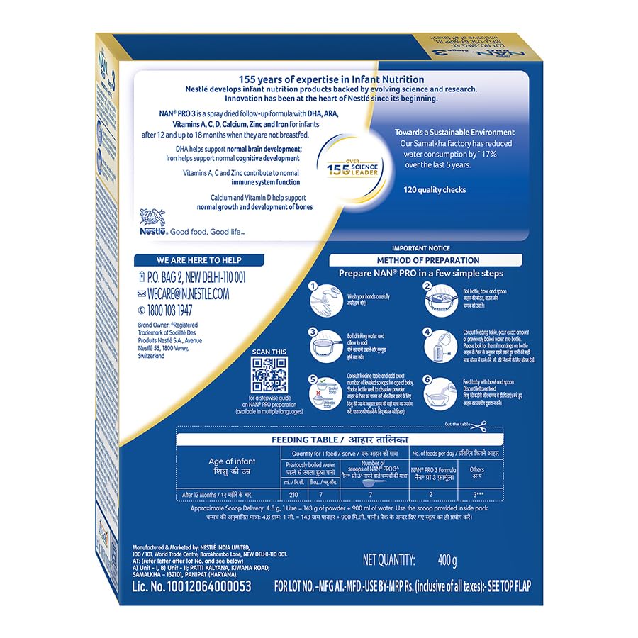 Over 155 years of scientific expertise in Infant Nutrition:Nestlé develops infant nutrition products backed by evolving science and research. Innovation has been at the heart of Nestlé since its beginning Supporting Brain Development:Contains DHA. DHA helps support normal brain development. Contains Iron. Iron helps support normal cognitive development Supporting Immune system function:Contains Vitamin A, C, Zinc & Iron, which contribute to normal immune system function Supporting bone growth and development:The formula contains Calcium & Vitamin D to support bone growth and development Important Notice:Mother's milk is the best for your baby