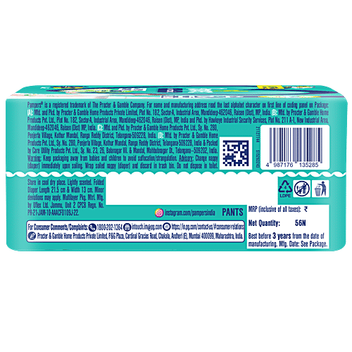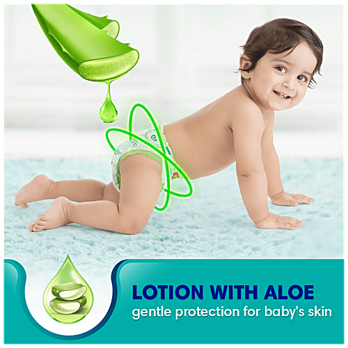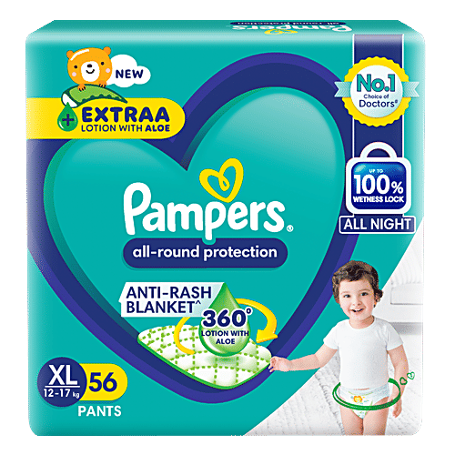 New Improved Pampers all round protection pants have Anti Rash Blanket* containing Lotion with Aloe Vera, to keep your baby’s skin protected from redness and rashes. Top quality diaper pants with Up to 100% Wetness Lock, keep the pee locked inside and baby's bum stays dry for All Night. Air channels & stretchy belts provide your baby breathable airy fit comfortable even in summer. Pampers unique Magic gel technology provides up to 12 hours of dryness and has up to 2X faster absorption. The new and improved design has Extra Soft material and a fit that adapts to your baby’s movements for the best comfort. Available in all sizes: Small diapers, medium diaper pants, large size diaper pants, XL diapers, XXL diapers, XXXL diaper pants. Our pants with fun exterior graphics, fun designs of characters, and a delightful fresh Aloe fragrance ensure you enjoy every change with your baby (*Blanket refers to soft top sheet with lotion. Helps prevent rash due to wetness).