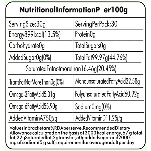 Patanjali Soybean Oil is a 100 % pure natural oil. It's good for our health. They are made with a refining process in which hard chemicals are removed with the help of enzymes. These are unadulterated and free from chemicals. Zero cholesterol present in the product completes a healthy oil that gives good energy. Patanjali Soybean Oil is healthy and digestive. It is a good source of omega-3. It also boosts the immune system. It promotes healthy skin and eyes and helps to regulate the cholesterol level.