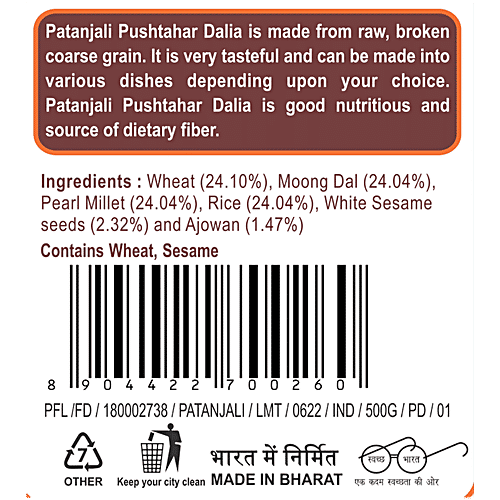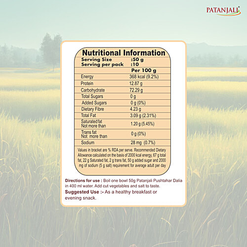 Patanjali Pushtahar Dalia is made from raw, broken coarse grain. It has a great taste and can be made into various dishes depending upon your choice. Patanjali Pushtahar Dalia is good nutritious and contains high fibre.