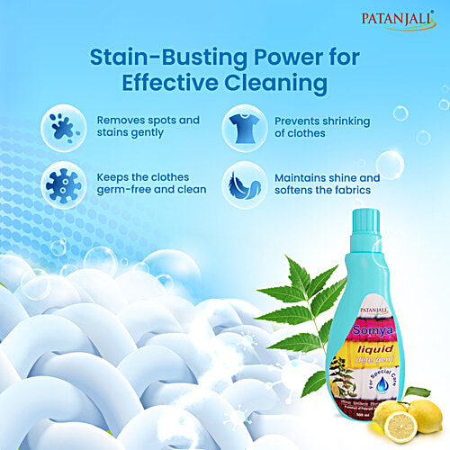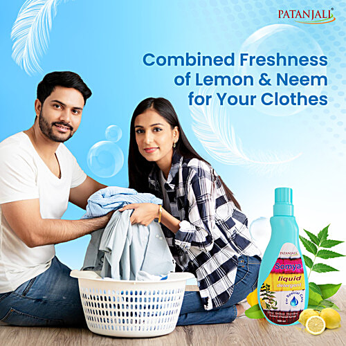 Experience the gentle care of Patanjali Somya Liquid Detergent. This herbal blend with lemon and neem cleanses, brightens, and removes tough stains while keeping your hands soft. Enjoy the long-lasting lemony freshness on your clothes.