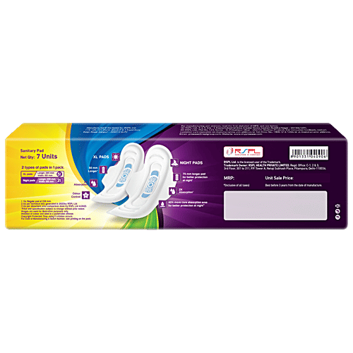 Pro‑ease Extra Night XL pads (7‑pack) featuring day 5 XL and night 2 XL pads with 2×/100% absorption boost, LeakLock gel, odour control, secure wings—ideal for day and heavy overnight protection.