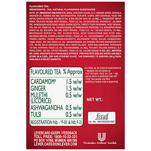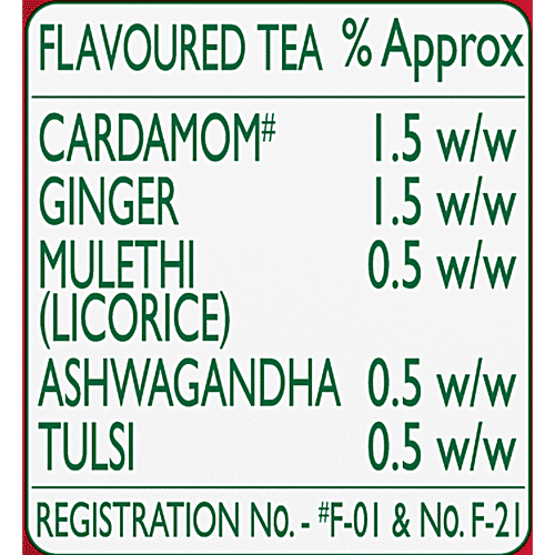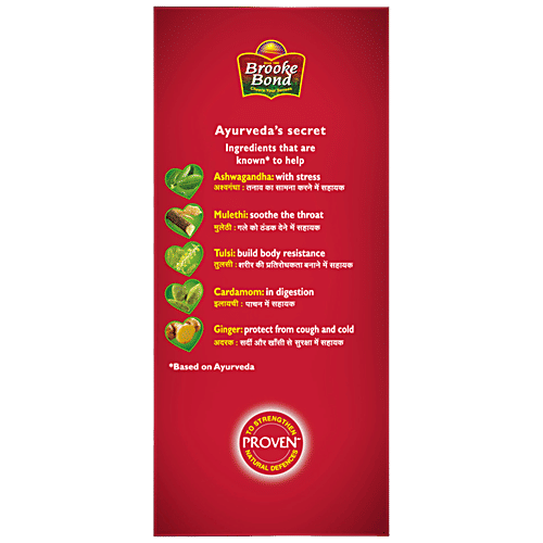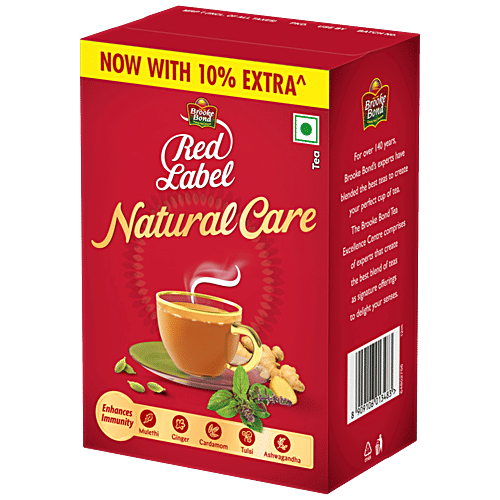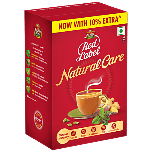 Red Label Natural Care Tea comes with the quality of Brooke Bond, trusted by tea consumers since 1869. Made with the goodness of 5 natural ingredients: Ginger, Cardamom, Tulsi, Mulethi, and Ashwagandha.