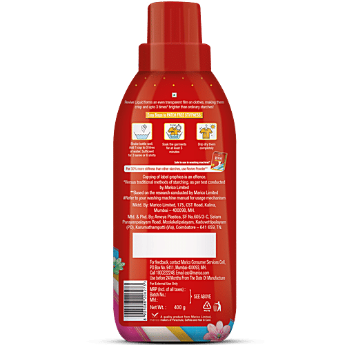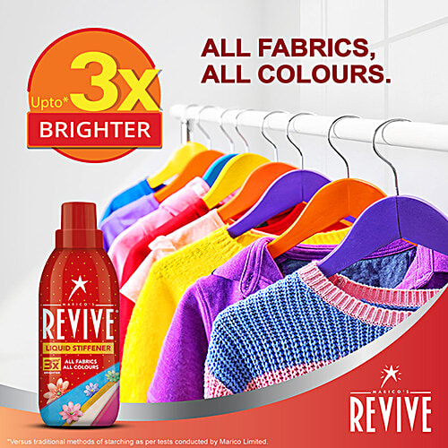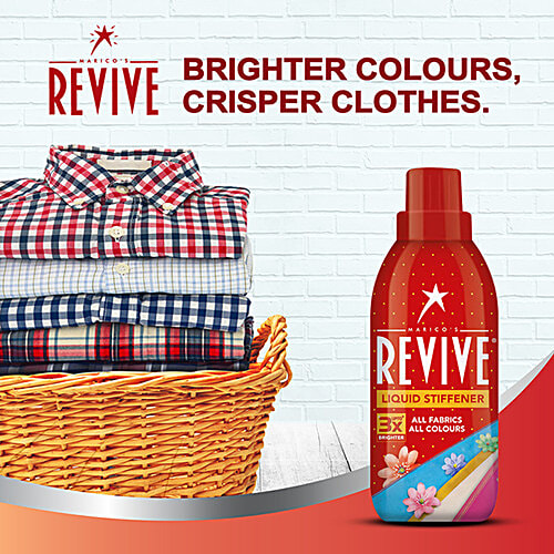 Revive was launched in 1993 by Marico (makers of Parachute & Saffola) that created a market where none existed. Revive starch powder gave consumers the convenience of an instant cold water starch at home. Revive Liquid Stiffener was launched in 2007 to make the clothes' starching process easy, convenient & patch-free. Revive Liquid Stiffener provides a fresh transformation to boring and lifeless clothes. Revive Liquid helps make your clothes crisp, fresh, and wrinkle-free. Revive starch liquid forms an even transparent film on clothes. It protects fabric from stains by coating individual fibers, thus keeping them stain-free. Revive Liquid makes clothes up to 3 times brighter than ordinary starches. This starch liquid for clothes preserves the brig